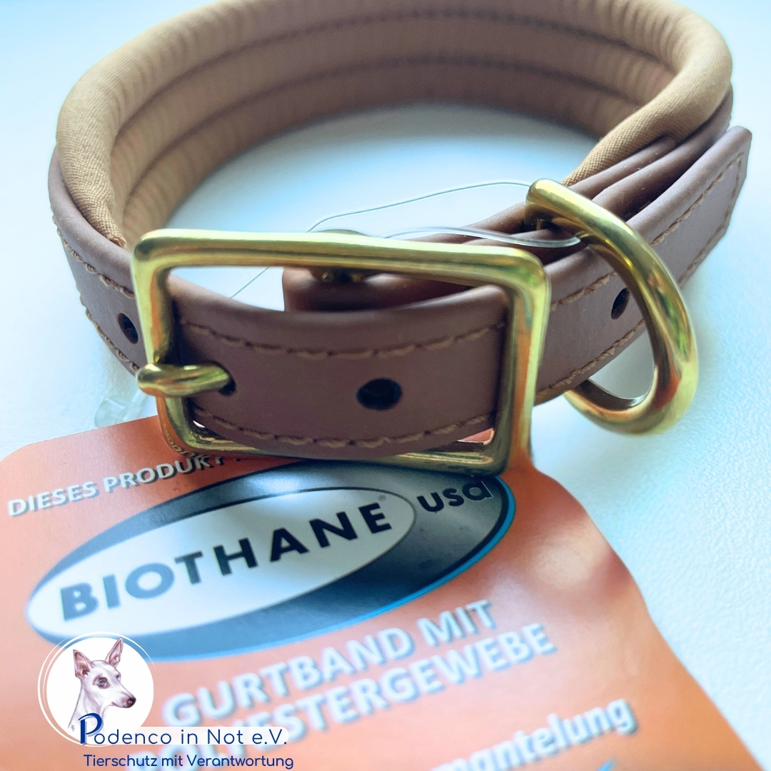 Hochwertiges, genähtes Biothane-Halsband, zweifarbig in Cognac. Doppelt unterlegt für höhere Stabilität – genäht statt genietet. Sehr gut abwischbar, ausgesprochen pflegeleicht. Edle Ziernähte, 25 mm breit. Rostfreie Beschläge aus Vollmessing oder Edelstahl, auch für Salzwasser geeignet. Neu.